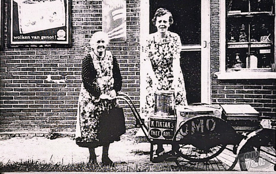 De Smidshornerweg te Niekerk, omstreeks 1943. Dit winkeltje heeft gestaan, waar nu aan deze weg 2 en 4a zijn gevestigd. Aan de oostkant woonde Rendert Zeldenrust en aan de westkant woonden deze dames; links Grietje Bosklopper en rechts Fenje Reitsema. Ze hadden een winkeltje en gingen met de handkar beladen met koffie, thee en wasmiddelen langs de huizen in Niekerk.